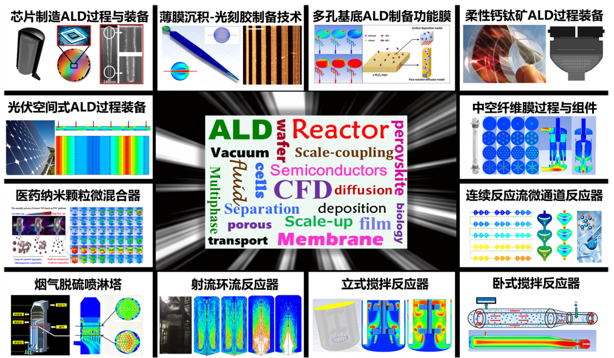 前沿基础应用研究:原子层沉积(ALD)、分子层沉积(MLD)、原子层刻蚀(ALE)、化学液相沉积(CLD)、化学气相沉积(CVD)、物理气相沉积(PVD)模型/模拟方法和工艺装备开发技术,以及它们在芯片制造、光刻胶制备、钙钛矿太阳能电池性能强化等方面的应用