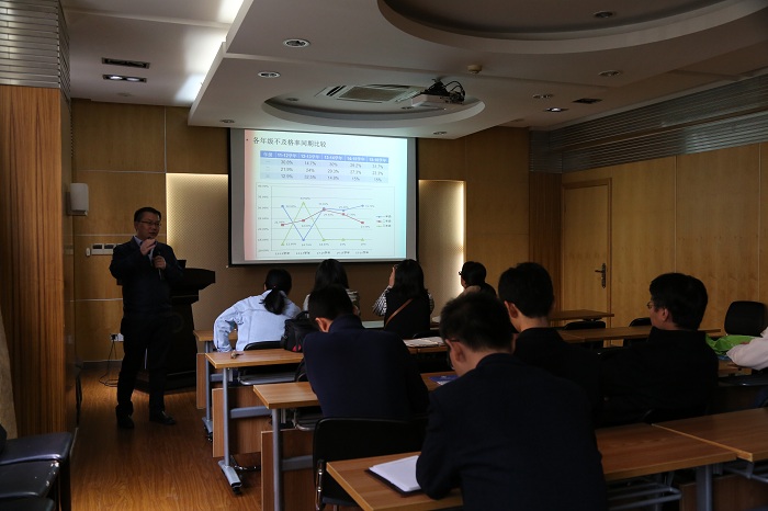赵双良首先介绍了此次会议的目的和要求,之后通报了学院本学期的学籍处理情况。通过对比分析近两年来全校各专业的不及格率数据,以及学院各年级的学籍处理情况,他从学生工作的角度分析了学院学风建设目前取得的成绩和存在的不足,并结合自身的带班经验对班导师和辅导员的工作提出了建议。