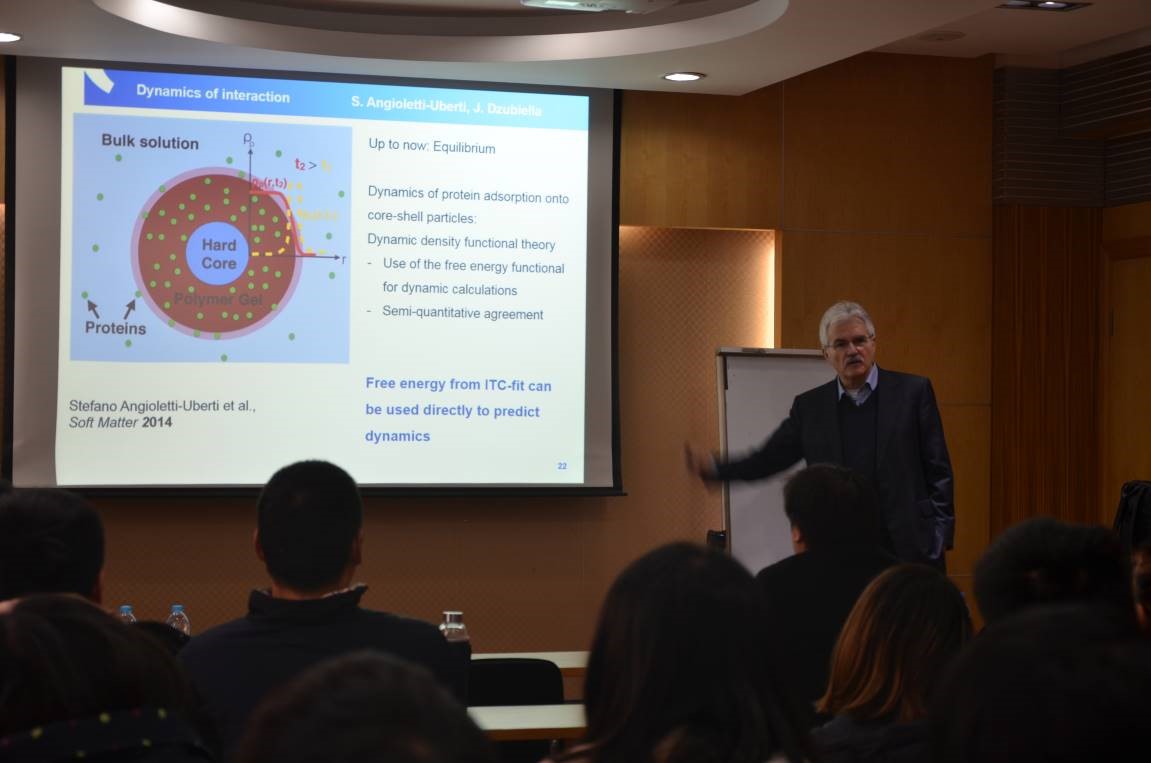 师生带来题为“Self-assembly of Proteins with Charged Polymers: Comparing experimental Data to Theory and Simulation”的学术报告(图1)。他的报告主要是关于聚电解质刷与蛋白质的相互作用,通过理论分析和计算机模拟,进一步加深了对其相互作用机理的理解。Ballauff教授丰富的知识和深入浅出的介绍,使ace动漫