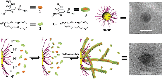 对于这些关键技术难题,课题组利用分子自组装“bottom-up”思想,在纳米微反应器聚丙烯酸球形聚电解质刷表面实现了对分子组装过程的定向诱导,突破了定向制备纳米尺度材料难的技术瓶颈。由于聚丙烯酸球形聚电解质刷表面负电性使得其周围富集了大量的质子,因而可以在聚丙烯酸球形刷表面原位催化模块分子1和2反应生成组装单元分子3(如图所示),进而使得分子3优先在聚丙烯酸球形刷表面完成组装,形成超分子纤维,实现在纳米尺度上对超分子凝胶纤维的组装生成进行定向控制。反应动力学研究表明聚丙烯酸球形刷表面富集的大量质子对超分子纤维的自组装过程具有催化促进作用。利用冷冻电镜技术证明了聚丙烯酸球形刷能够在纳米尺度上实现对超分子凝胶纤维组装生成的原位定向诱导。该研究得到了国家留学基金管理委员会的资助和支持。