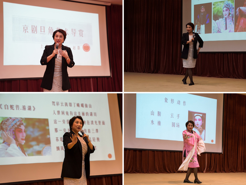 赵群通过动作示范和现场互动形象地介绍了京剧的行当和四功五法,带领在座师生体验、感受国粹京剧的“写意”和“虚拟”之美。赵群讲戏入戏,学生听戏入神,“十三响”“耍花枪”“兰花指”“驾彩云离却了峨嵋仙山”“早成美眷扫狼烟”等精彩的动作、优雅的表演和优美的演唱将讲座一次次推向高潮,掌声不断。