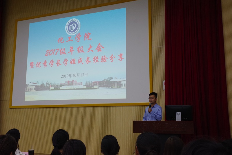 于A200教室召开2017级年级大会暨优秀学长学姐成长经验分享会,大会由辅导员姜贤武主持,400余名17级学生参加。