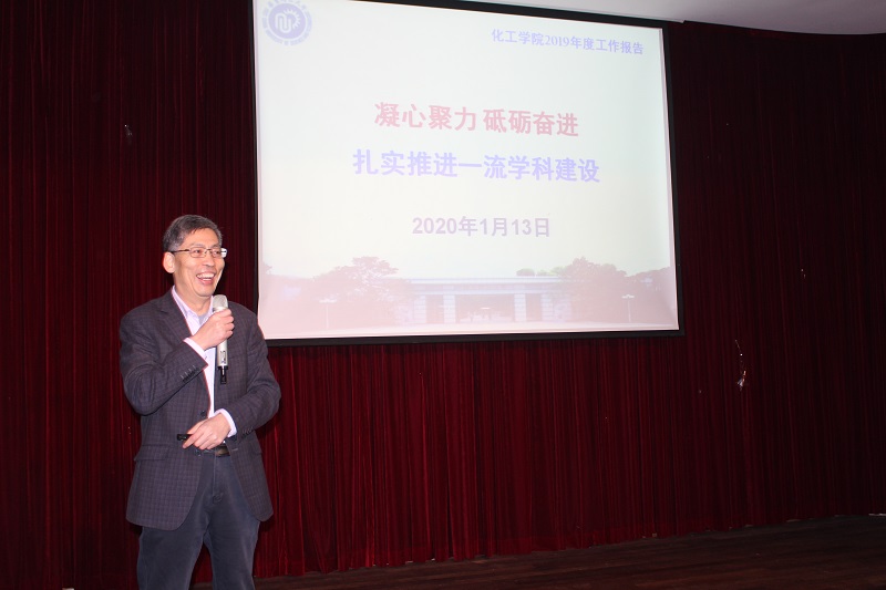 党委书记朱学栋首先致辞,向一年来为学院在教学科研等方面辛勤工作的各位老师表示衷心的感谢!并向全体教职工表达了新年的祝福。随后院长李春忠从学科建设、师资队伍建设、科学研究等方面全面回顾总结了学院在2019年取得的成绩。同时部署了2020年学院的重点工作,希望全院师生凝心聚力、砥砺奋进,切实推进一流学科建设。
