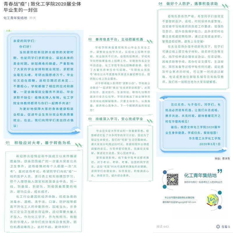 学生党员先锋促就业小组,全员、全方位开展毕业生就业指导和帮扶工作。3月1日发布《致2020届全体毕业生的一封信》,鼓励同学们开启一段“隔屏不隔情·相隔不相忘”的求职之旅,共同打赢这场没有硝烟的疫情防控战役!
