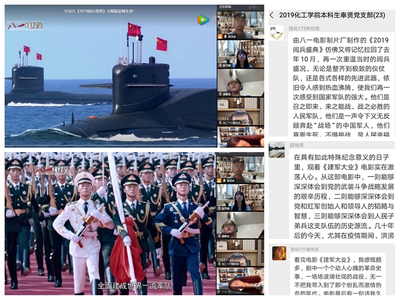当天晚上,学生党支部召开“八一”专题组织生活,观看纪录片《2019阅兵盛典》和《建军大业》,发表学习感想,向军人致敬。退伍军人张正雄表示,为自己曾是一名中国军人而感到骄傲,更为祖国的伟大强盛感到无比自豪!