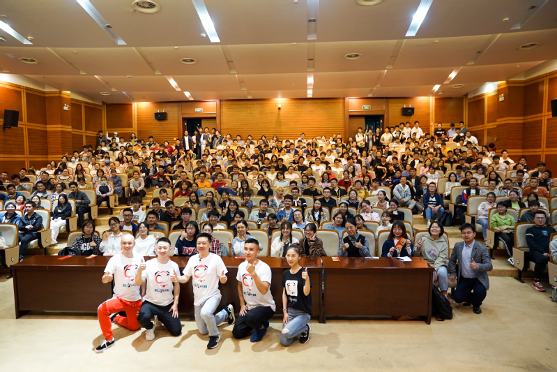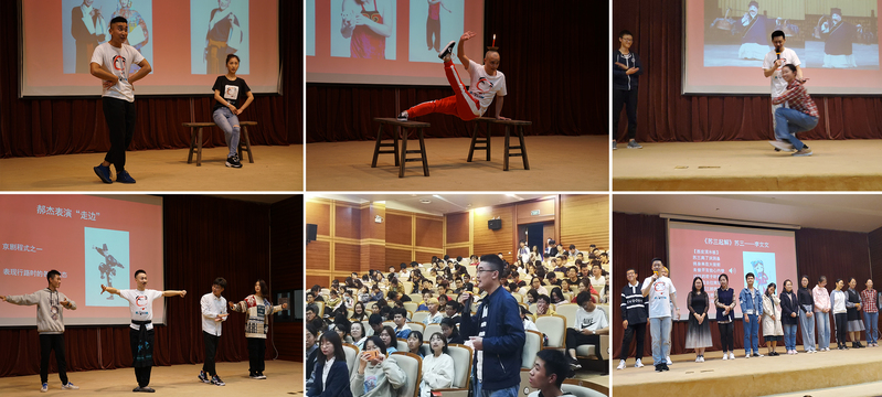 严庆谷介绍了京剧丑角行当的发展脉络和“丑中见美”的独特审美风格,分享了他学戏的经历。讲座中,优秀青年演员朱何吉、王盾、郝杰、李文文为同学们展示了顶灯、矮子功、“走边”等绝活和《荷珠配》片段。幽默风趣的讲解、默契的表演、精彩的互动让同学们连连拍手叫好,将讲座一次次推向高潮。京剧票友社的同学共同表演了《苏三起解》选段。最后,严庆谷还演唱了英文版《搜孤救孤》,为本次活动画上了圆满的句号。