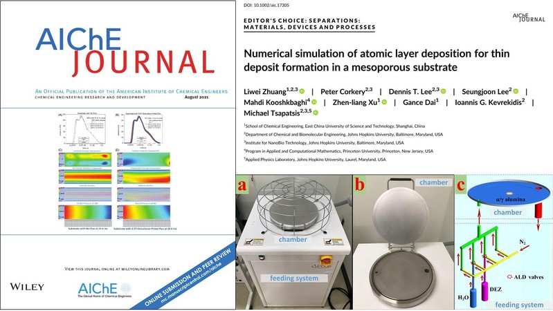 膜科学与工程许振良教授团队,与美国约翰霍普金斯大学、普林斯顿大学等单位合作,开发了一套原子层沉积(ALD)反应器多尺度模型,可用于预测ALD反应器尺度高真空流体流动、传热、传质过程和衬底纳米孔道内薄膜沉积过程。该研究工作以“Numerical simulation of atomic layer deposition for thin deposit formation in a mesoporous substrate”为题(DOI:10.1002/aic.17305),以封面形式发表于AIChE Journal,被期刊评为“Top Tier”等级,同时将作为2021年8月Editor’s Choice论文在期刊主页宣传一个月。