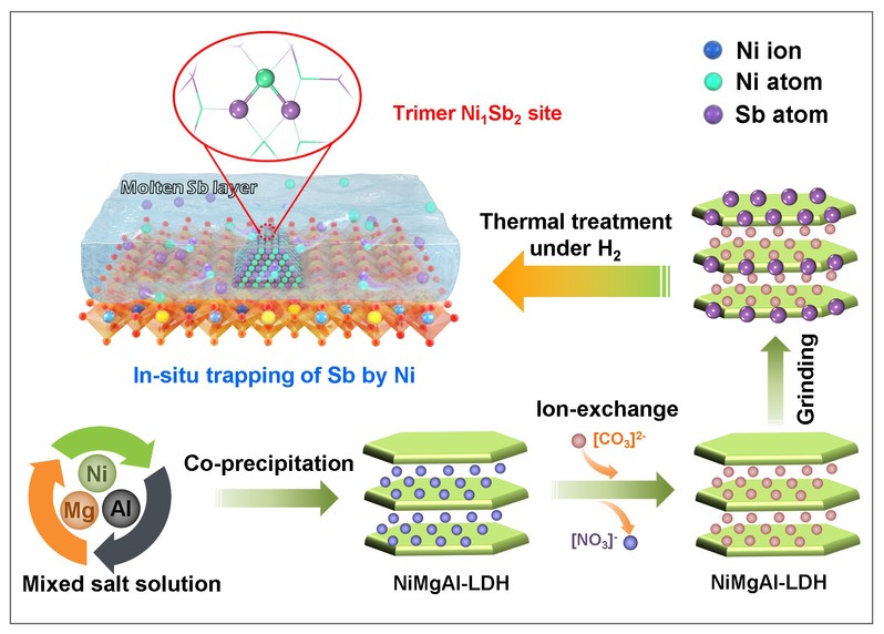 进一步,该团队创新发展Ni原子原位捕获熔融Sb的新策略,通过从NiMgAl水滑石(NiMgAl-LDH)中还原脱溶的Ni原子与熔融的Sb原子键合,生成的NiSb原子对在高温条件下形成长程有序、结构稳定的NiSb金属间化合物催化剂。通过球差电子显微镜和X射线吸收谱等表征技术对催化剂结构解析,证实了Ni1Sb2三原子活性位点的成功构筑。催化反应性能评价表明,NiSb催化剂在乙炔转化率为100%的情况下,乙烯选择性可达93.2%,表现出优异的催化加氢性能。