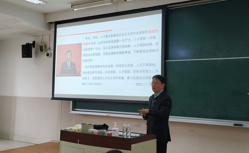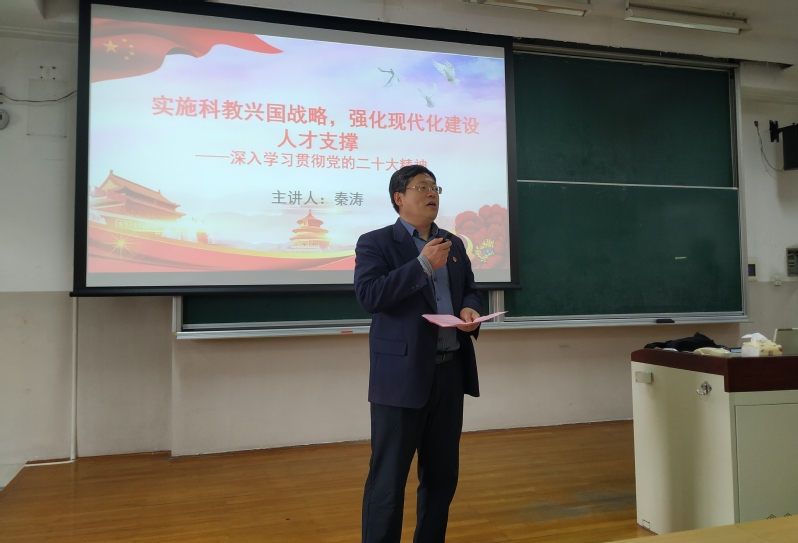 秦涛以“实施科教兴国战略,强化现代化建设人才支撑——深入学习贯彻党的二十大精神”为题,从党的二十大主题讲起,围绕我国发展面临的问题、应对问题的总方略、完善科技创新体系、加快实施创新驱动发展战略、深入实施人才强国战略、办好人民满意的教育等方面,对党的二十大报告中的“科教兴国战略”进行了全面系统的阐述。报告中丰富的案例和详实的数据,让学院教师对党的二十大精神有了更全面、更深刻的理解和认识。