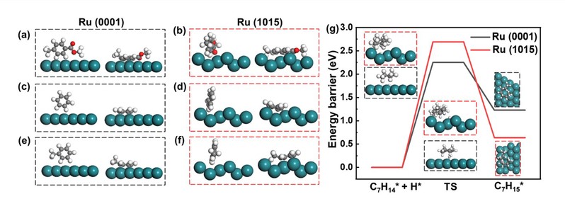 同位素示踪实验和密度泛函理论计算结果表明,PET氢解中间物种在低配位位点钌上更倾向于“直立”吸附,而在高配位位点钌上更倾向于“平躺”吸附。其中,“直立”吸附构型能够抑制苯环加氢及开环副反应,进而促进三苯生成。