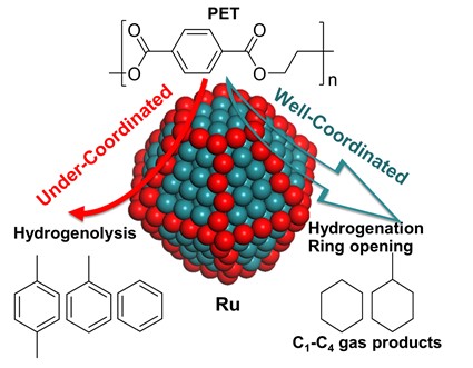 该工作针对PET催化氢解制备三苯,通过解耦钌基催化剂的几何效应和载体效应,阐明了钌配位环境对PET氢解中间物种吸附构型的影响规律,揭示了中间物种吸附构型对PET氢解反应路径的调控机制,基于此精确调控钌基催化剂的配位环境,实现了PET定向氢解制备目标产物三苯。该工作为芳香塑料氢解高效催化剂设计提供了一种新策略。
