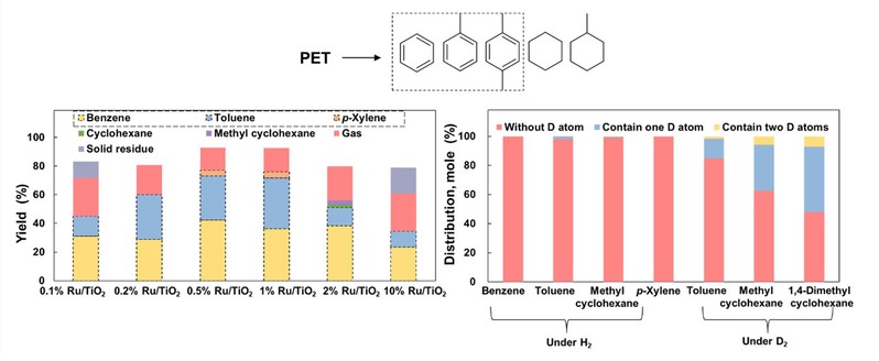 聚对苯二甲酸乙二醇酯(PET)在全球塑料产量中位居第四(~11%),是重要的芳香塑料。PET是由石油基的芳香单体通过缩聚生成,其经化学回收能够制备重要有机化工原料苯、甲苯、二甲苯(三苯)。该过程中的产物分布和反应路径调控高度依赖于催化剂结构与性质,目前仍然面临产物分布广、芳烃收率低等问题。因此,发展PET高值化学回用的低碳技术,对解决环境和能源问题至关重要。