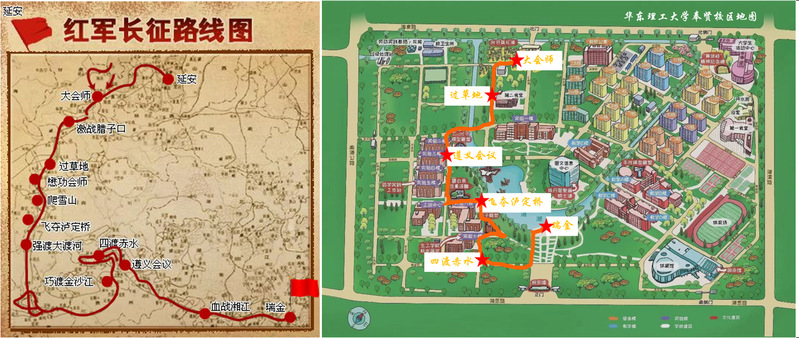 活动依据红军长征路线,结合校园建筑特色,以亲水平台作为“长征”起点,共设置墨子像、慢时广场、C60、大草坪以及油菜花田5个打卡点位,分别代表四渡赤水、飞夺泸定桥、遵义会议、过草地和大会师5个历史阶段。