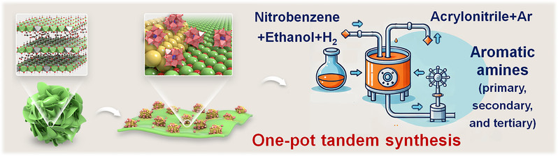 芳香胺类化合物是制药、染料、农药、橡胶添加剂和杂环化合物等众多领域的重要中间体,在医药和化工行业中扮演着关键角色。然而,传统的芳香胺合成方法通常涉及多步反应,存在原子经济性低、产率不足、反应条件苛刻、副产物过多以及环境问题等局限性。近年来,一锅法串联催化作为一种新兴的绿色合成方法,能够在单一反应器中完成多个反应步骤,避免了传统合成中的多步纯化过程。然而,将多步反应集成到一个反应器中面临着催化机制复杂、反应路径竞争、中间体不兼容以及副产物过多等挑战,尤其是在设计具有三种或更多不同活性位点的催化剂时,这些活性位点之间可能存在相互抑制的问题。因此,如何克服这些挑战并实现高效的串联催化合成仍然是一个亟待解决的问题。