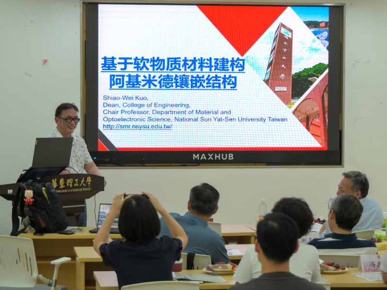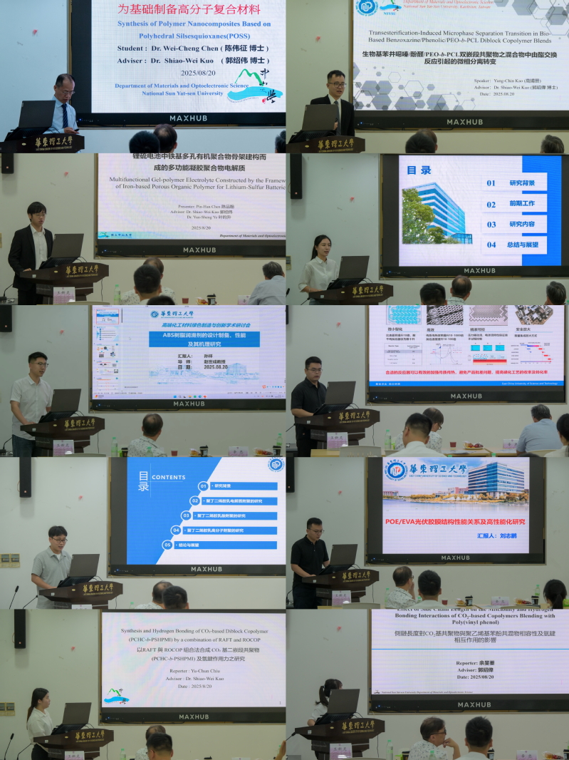 在上午的学术汇报中,台湾中山大学的陈伟征博士、多名研究生及华东理工大学的多名研究生分别作了题为“以双官能基-倍半硅氧烷笼状寡聚体为基础制备高分子复合材料”“噁嗪结构与抗菌性能的构效关系及改性聚乙烯复合材料的制备”“生物基苯并噁嗪/酚醛/PEO-b-PCL双嵌段共聚物之混合物中由酯交换反应引起的微相分离转变”“基于微反应器的丹参酮ⅡA磺酸钠的连续化制备过程研究”“用于锂硫电池的铁基多孔有机聚合物骨架多功能凝胶聚合物电解质”“ABS树脂润滑剂的设计制备、性能及其机理研究”“利用RAFT聚合合成不同链段之二氧化碳基嵌段共聚物及其分子间氢键作用力之研究”“EVA/POE光伏胶膜结构性能关系及高性能化研究”“聚丁二烯胶乳粒径调控策略与附聚机理的研究”等学术报告,为攻克相关技术难题提供了新思路,双方积极研讨,碰撞思想,凝聚共识,并就高端化工材料未来发展进行了深入探讨。