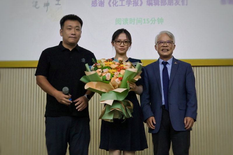 报告结束后,现场进入气氛热烈的开放提问环节。新生们积极举手,就“化工青年如何规划自身成长”“如何培养科研思维”等关切的问题与朱教授互动交流。每当朱教授做出精辟解答时,台下便有阵阵会意的点头和激烈的掌声。随后,2025级新生代表贾悦桐向朱世平教授献花致敬,全体师生代表与嘉宾合影留念。