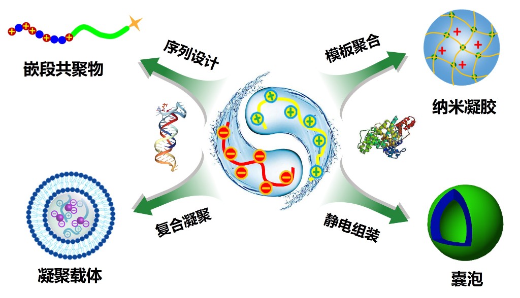 课题组主要从事生物医用高分子材料合成和应用研究。利用带电聚合物嵌段序列设计和静电相互作用组装制备聚电解质复合胶束、囊泡和纳米凝胶等功能载体,用于核酸和蛋白质药物的高效递送和疾病诊疗应用(图 1)。